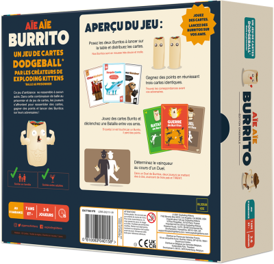 Aïe Aïe Burrito, c’est ce que vous obtenez lorsque vous croisez un jeu de cartes avec la balle au prisonnier. Essayez de rassembler des cartes identiques plus rapidement que vos adversaires tout en esquivant et en lançant des burritos aériens. Les cartes que vous accumulez rapportent des points, mais si vous êtes touché par des burritos volants, vous les perdez.