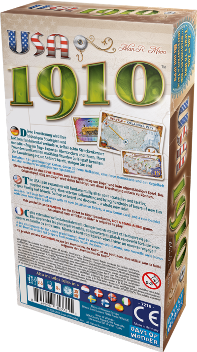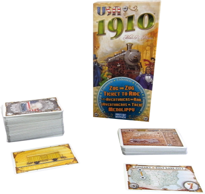 Les Aventuriers du Rail 1910 est une extension pour les Aventuriers du rail vous propose de découvrir 181 cartes maintenant au même format que celle de Marklin et de la version Europe du jeu. Parmi celles-ci, 35 nouvelles cartes destination, et une toute nouvelle carte bonus « Globe Trotter ». Cette extension propose aussi une nouvelle version réécrite des règles du jeu avec trois nouvelles façons de l’emporter, ainsi que des règles spécifiques à USA 1910.