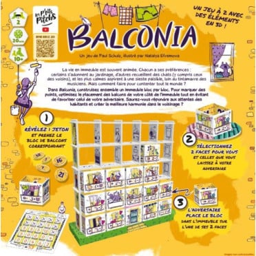 Dans Balconia, construisez ensemble un immeuble bloc par bloc. Pour marquer des points, optimisez le placement des balcons de votre côté de l’immeuble tout en évitant de favoriser celui de votre adversaire. Saurez-vous répondre aux attentes des habitants et créer la meilleure harmonie dans le voisinage ?