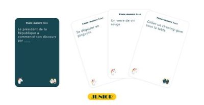 Un joueur est désigné « question master » et lit une carte bleue avec une phrase à trou(s), tous les autre joueurs posent une carte blanche. Celui qui a posé la carte la plus drôle gagne la manche puis lit la carte bleue suivante et ainsi de suite. Le premier joueur à 5 points est l’heureux vainqueur !
