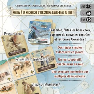 Cartaventura : Lhassa : Printemps 1916. Journaliste de guerre, vous venez de fuir l’enfer des tranchées. Traumatisé par l’expérience, vous partez en reportage vers des cieux plus cléments. Séduit par la lecture d’un ouvrage d’Alexandra David Neel relatant du Bouddhisme pratiqué en orient, vous décidez que votre périple suivra le sien. Le Sri Lanka, l’inde, le Tibet et, qui sait, peut-être aurez-vous l’occasion d’éclairer vos lecteurs sur la mystérieuse cité de Lhassa. Découvrez une partie du monde qui oscille entre réalités coloniales et sagesse orientales.