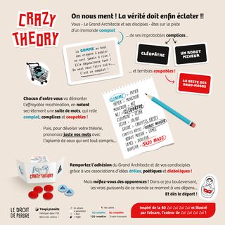 Remporter le plus de jetons d’influence en exposant vos théories du complot avec assurance et humour. Chaque tour, un joueur est le Grand Architecte et pose un complot, deux complices et deux coupables autour de l’étui. Les autres joueurs notent secrètement une suite de mots qui relie le complot aux coupables en passant par les complices. Puis ils révèlent leur théorie à voix haute en répétant leurs mots. Le Grand Architecte révèle ensuite le coupable qu’il a choisi et distribue des jetons aux joueurs qui ont le même. Les joueurs peuvent aussi donner un jeton au joueur qui les a le plus fait rire. À la fin de la partie, on révèle le groupe d’influence qui se cache dans l’étui et on compte les points.