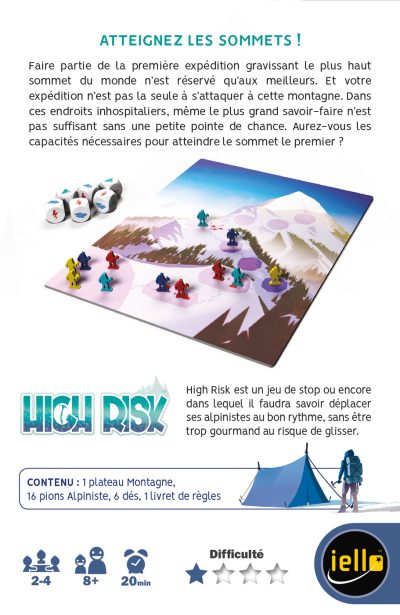 Sur un mini-plateau de jeu qui représente l’ascension, les joueurs lancent les dés et tentent d’obtenir le meilleur résultat. Attention à la météo, toujours changeante, qui peut à tout moment se retourner contre vous si vous tentez de pousser votre ascension un peu trop loin. Heureusement, des bivouacs présents tout au long du tracé vous permettront de reprendre des forces… et de ne pas retomber trop bas. Tout en élégance et simplicité, High Risk pousse les joueurs dans leurs derniers retranchements en les incitant à effectuer des choix toujours plus dangereux. Un Mini Games qui prend de la hauteur ! Dernier venu de la gamme Mini Games, High Risk est idéal pour des parties rapides entre amis ou en famille, sur le thème de la gestion du risque… et de la chance ! Et n’oubliez pas que les équipes doivent arriver complètes au sommet pour obtenir la victoire !