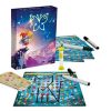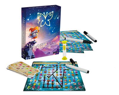 96 cartes grand format, 4 plateaux individuels, 4 feutres effaçables avec effaceur, 1 sablier, 1 règle du jeu