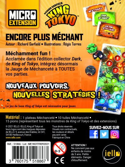 Dans King of Tokyo – Extension : Encore plus méchant est une extension apporte à King of Tokyo de nouveaux pouvoirs et de nouvelles stratégies grâce à un nouveau plateau de jeu: le plateau Méchanceté, intégrée initialement dans l’édition collector Dark de King of Tokyo.