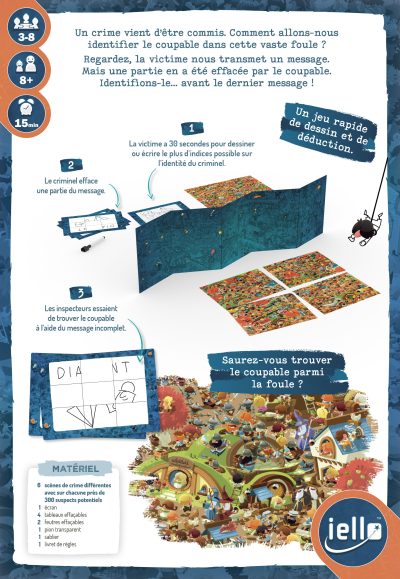 Mais attention : les enquêteurs ne disposent que de 4 manches pour trouver le coupable ! Une fois l’ardoise en main, les enquêteurs doivent identifier un personnage précis parmi 300 autres, rien de moins. Autant dire qu’il leur faudra scruter les scènes de crimes afin d’y dénicher leurs moindres détails. S’ils parviennent à identifier le coupable avant la fin de la 4e manche, ils l’emportent. Sinon, le coupable remporte la partie !