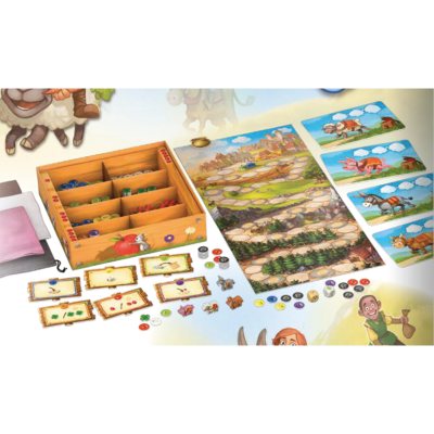 Contenu de Le Grand Prix de Belcastel ! : 1 plateau (recto/verso), 4 plateaux animal, 6 plateaux action (recto/verso), 162 jetons nourriture, 18 jetons herbe de rêverie, 26 trèfles, 40 rubis, 1 chaudron en or, 4 pions (âne, mouton, cochon, vache), 2 dés, 4 sacs de nourriture, 1 Fiche Plateaux action et Variantes, 1 règle du jeu.