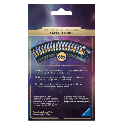 Lorcana C1- Sleeves Capitaine Crochet contient 65 pochettes de protection pour le jeu disney lorcana vous est proposé avec plusieurs choix d’illustrations. 3 Visuels sont disponibles : Capitaine Crochet, Elsa et Mickey