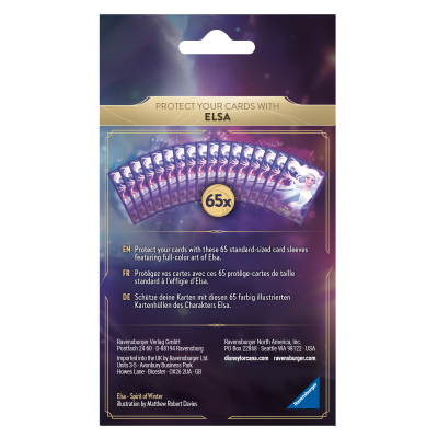 Contenu de Lorcana C1 – Sleeves Elsa : 65 sleeves de taille standard ( 63x88mm )