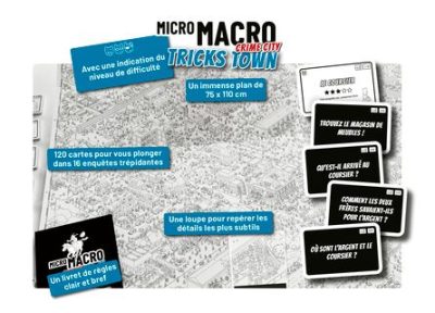 Tricks Town est le troisième volet de la série MicroMacro. Venez y découvrir une nouvelle partie de la ville, avec ses 16 enquêtes inédites et plus corsées à mener. Ce jeu est indépendant des premiers volets. Il n‘est pas nécessaire de posséder ou d‘avoir joué aux épisodes précédents pour vous lancer dans ces nouvelles affaires !
