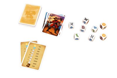 8 dés Corsaires, 35 cartes Pirates, 5 cartes résumé ,Règle du jeu