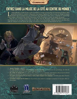 Dans les trois aventures réunies dans ce volume de près de 300 pages, Agents d’Absalom propose aux PJ de découvrir la vie d’agents de la milice et de veiller sur les Absaloniens. Victimes de tueurs en série, d’un culte de sadiques et d’une guerre des gangs, vos pauvres concitoyens ont bien besoin de vous !