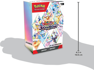 Dans Pokémon EV8.5 : Bundle de 6b Pokémon des boule de poils adorable ou attaquant tout feu tout flamme, partenaire à la personnalité de glace ou compagnon gracieux et élégant, Évoli et ses Évolutions occupent une place spéciale dans le cœur de tous les Dresseurs et Dresseuses Pokémon ! Découvrez leurs nouveaux pouvoirs uniques en tant que Pokémon-ex Téracristal Stellaire, et partez à la recherche de votre propre trésor parmi une multitude de Pokémon-ex de Paldea et d’ailleurs. Des gemmes scintillantes et des motifs cachés vous attendent au bout de l’arc-en-ciel dans l’extension Écarlate et Violet – Évolutions Prismatiques du JCC Pokémon !