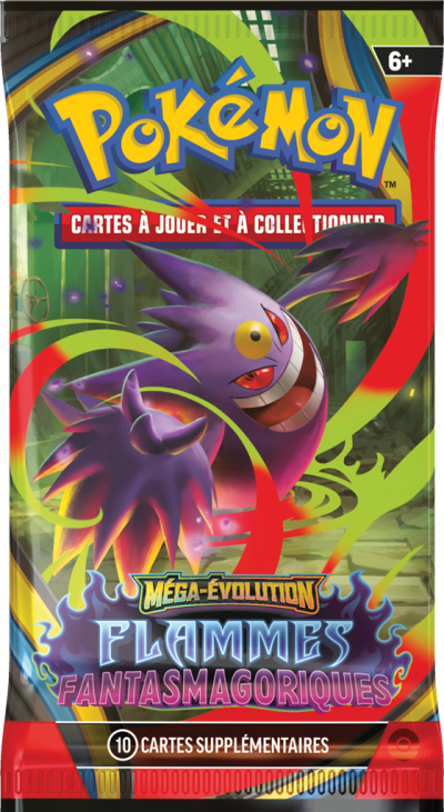 Chaque booster de l’extension Méga-Évolution – Flammes Fantasmagoriques du JCC Pokémon contient 10 cartes, 1 énergie de base ou 1 carte à code pour le JCC Pokémon Live.