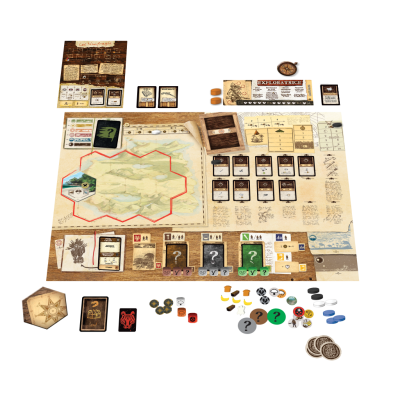 90 cartes Aventure, 73 cartes Événement, 52 cartes Mystère, 12 dés spéciaux, 7 scénarios, 1 livret de règles, de nombreux pions en bois, des cartes Équipement, Invention, Bête, des tuiles Île, des fiches Personnage, et bien plus encore !