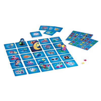 Choisissez une Grille du Ciel et formez un quadrillage de 5 x 5 cartes Image en prenant soin de positionner la carte Lune au bon endroit. Chaque joueur choisit le pion Astronaute qu’il préfère et la couleur d’étoiles associée. Placez les pions Astronaute, le pion Lune et les étoiles de couleur comme indiqué par la Grille du Ciel. Les étoiles non-utilisées restent dans la boîte.