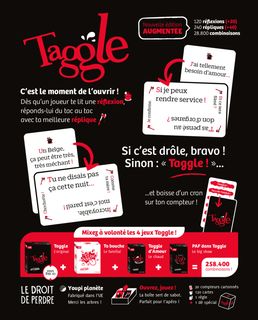 Taggle Le jeu des répliques qui claquent est un jeu d’ambiance et d’expression qui vous donne une bonne occasion de l’ouvrir ! Ce jeu de la famille “Taggle” est un générateur de répliques. Il offre 120 réfléxions, 240 répliques et 28 800 combinaisons. Il fera de vous et vos amis les rois de la répartie.