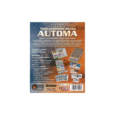 Terraforming Mars: Automa vous offre une nouvelle expérience solo pour vos parties de Terraforming mars. Au lieu d’une ” simple” course contre la montre, l’Automa, prénommé Marsbot, vous permet d’affronter des corporations dirigées par des algorithmes et des cartes spéciales, et vous offre la possibilité d’ajouter librement les extensions dont vous avez besoin pour créer le défi auquel vous aspirez.