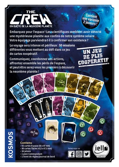 Dans ce jeu, les joueurs incarnent les membres d’un équipage spatial en voyage vers une mystérieuse planète. Mais le périple s’annonce épique, car il faudra accomplir 50 missions de plus en plus périlleuses avant de pouvoir atteindre la destination. Pour remporter une mission dans The Crew, chaque joueur doit accomplir les tâches qui lui sont assignées. A chaque tour de jeu, les joueurs jouent une unique carte de leur main pour former un pli. Le joueur qui veut accomplir sa tâche doit non seulement remporter le pli, mais aussi s’assurer que la carte correspondant à la tâche soit présente dans le pli !