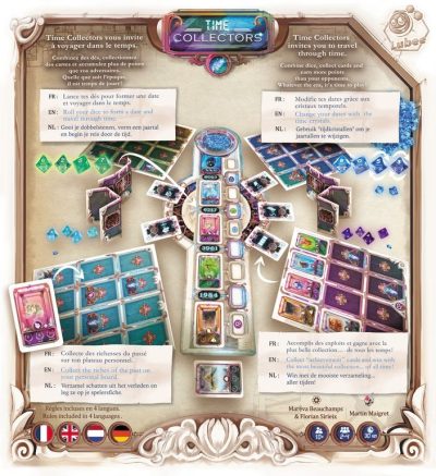 Voyagez dans le temps grâce aux dés et aux « cristaux temporels » . Il vous faut aussi constituer la plus belle collection de richesses passées, en accumulant plus de points que son ou ses adversaire(s). La partie se termine lorsqu’un joueur a collectionné au moins 10 cartes sur son plateau personnel.