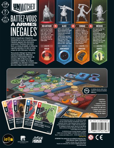 La première boîte d’Unmatched vous permet d’incarner Le Roi Arthur, Alice au Pays des Merveilles, Méduse ou Sinbad le Marin. Chaque personnage est accompagné de jetons alliés, et surtout d’un deck de cartes qui lui est propre, proposant de nombreux combos particulièrement efficaces.